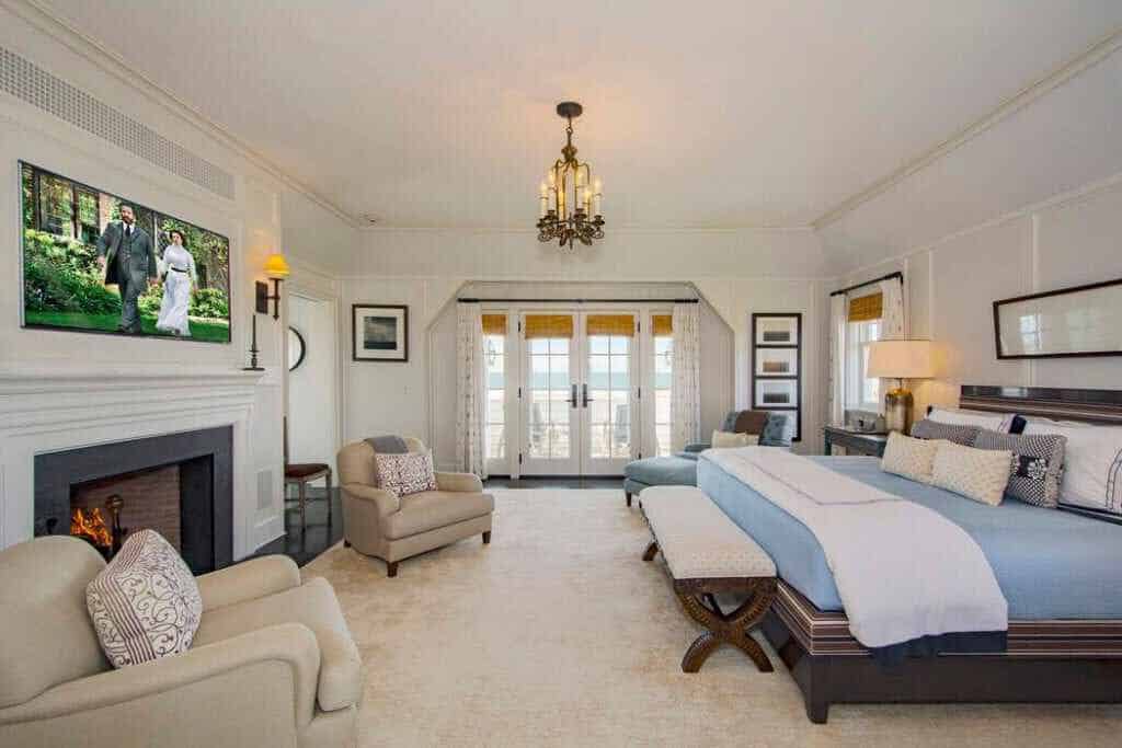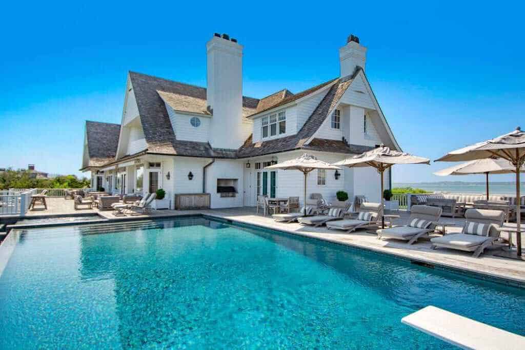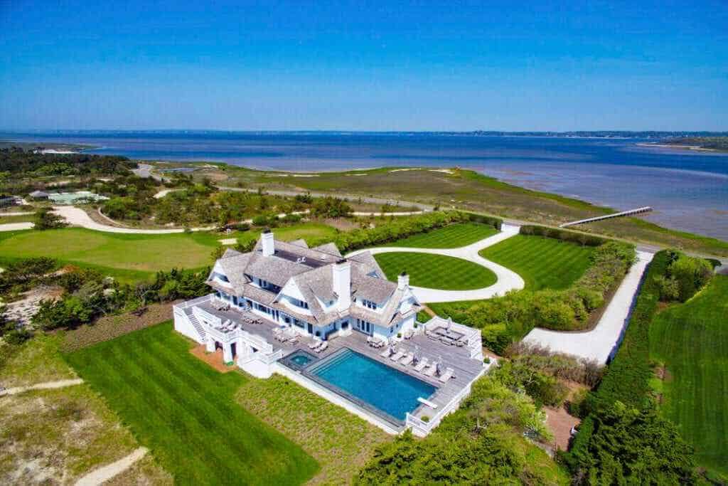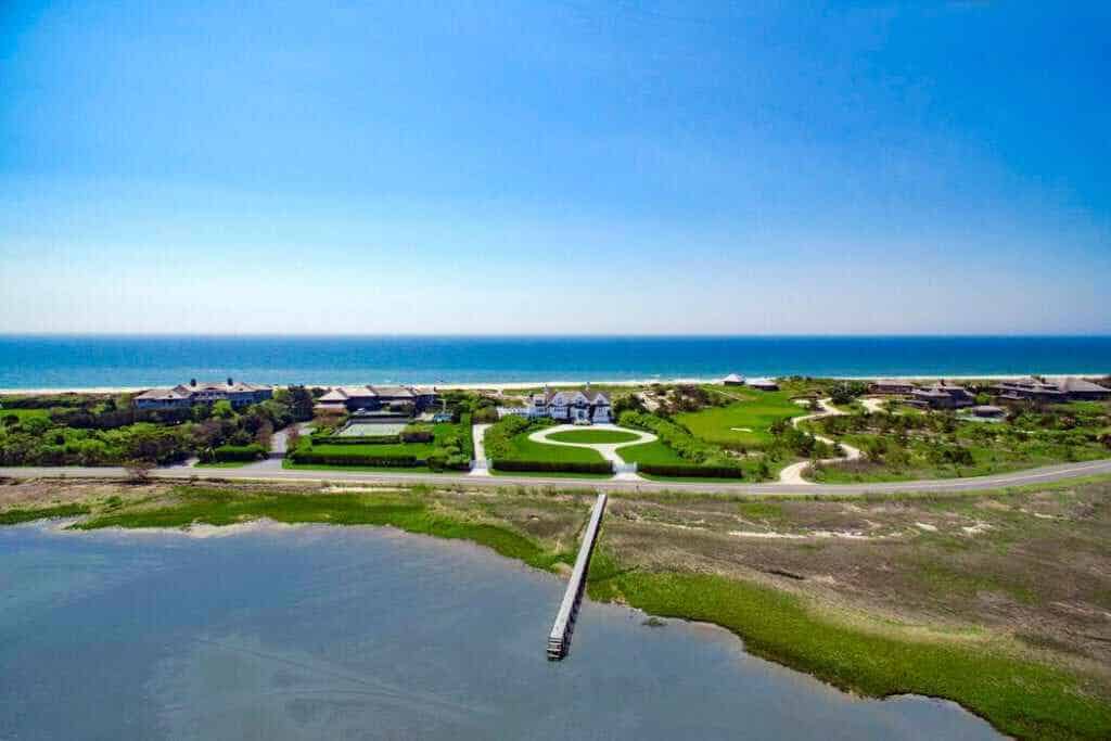 On Southampton’s prized Meadow Lane, this stately beach residence comprising 3.35 +/- acres and 535 +/- ft. waterfront in total, commands 360-degree unobstructed views of both the Atlantic Ocean and Shinnecock Bay. Complete with its own private dock and mooring, the property is approached through a large full-circle driveway surrounded by well-manicured gardens and mature plantings. The three-tiered white-stained shingle-sided home is replete with outdoor decks, terraces, and patios on all levels. The Steven Gambrel designed interiors, with dark polished floors, layered accents and curated materials, creates a beautiful but welcoming coastal retreat. From the entry steps to the main gallery, the primary gathering rooms open onto ocean-facing decks and include: A great room with fireplace, formal dining room with fireplace, family room with fireplace, guest bedroom with full bath, and a bay-facing junior master suite. The professional chefs kitchen is elegant and functional with dark textured stone counters, Viking, Subzero, and Thermador appliances, and double dishwashers. The ocean-facing heated Gunite pool and spa are sited off the family room, while a central elevator conveniently serves all three levels. Upstairs, the landing with deck and service bar leads on one side to an over-sized master suite with fireplace, private ocean-facing deck, walk-in closets and generous marble bath. The adjoining side includes three guest suites and a laundry with double washer/dryer. The beach-front lower level offers a media/recreation room, gym, three full baths, wine cellar, laundry with double washer/dryer, wet bar for the full length covered terrace, and access to the connected two-car garage.