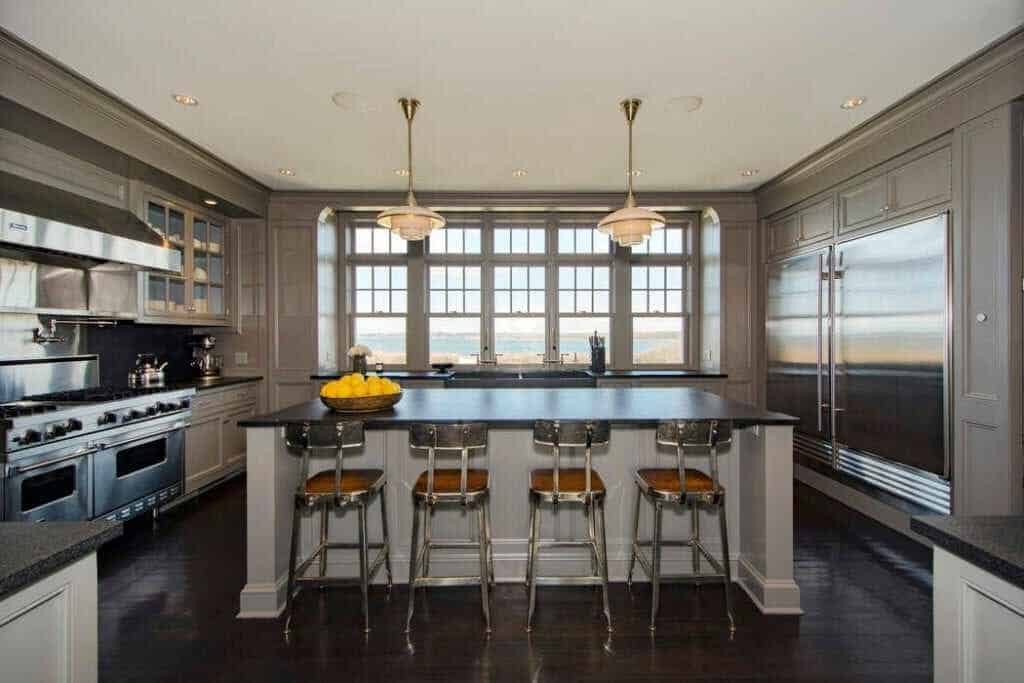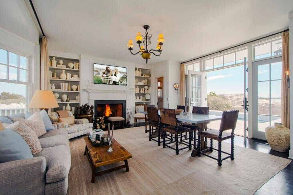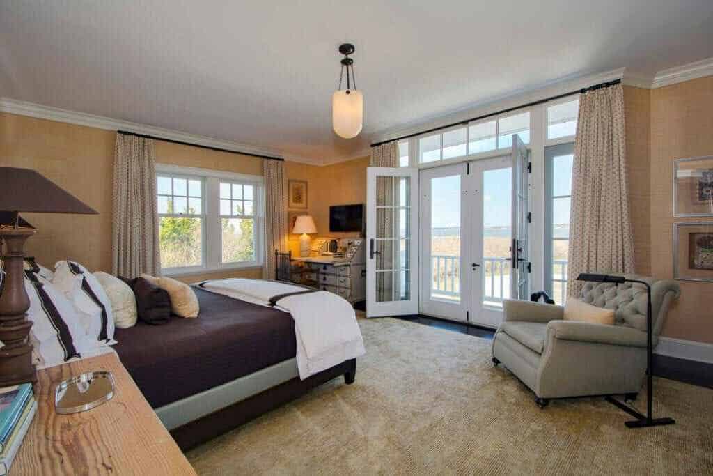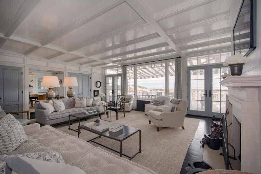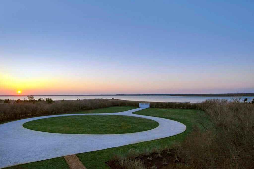 On Southampton’s prized Meadow Lane, this stately beach residence comprising 3.35 +/- acres and 535 +/- ft. waterfront in total, commands 360-degree unobstructed views of both the Atlantic Ocean and Shinnecock Bay. Complete with its own private dock and mooring, the property is approached through a large full-circle driveway surrounded by well-manicured gardens and mature plantings. The three-tiered white-stained shingle-sided home is replete with outdoor decks, terraces, and patios on all levels. The Steven Gambrel designed interiors, with dark polished floors, layered accents and curated materials, creates a beautiful but welcoming coastal retreat. From the entry steps to the main gallery, the primary gathering rooms open onto ocean-facing decks and include: A great room with fireplace, formal dining room with fireplace, family room with fireplace, guest bedroom with full bath, and a bay-facing junior master suite. The professional chefs kitchen is elegant and functional with dark textured stone counters, Viking, Subzero, and Thermador appliances, and double dishwashers. The ocean-facing heated Gunite pool and spa are sited off the family room, while a central elevator conveniently serves all three levels. Upstairs, the landing with deck and service bar leads on one side to an over-sized master suite with fireplace, private ocean-facing deck, walk-in closets and generous marble bath. The adjoining side includes three guest suites and a laundry with double washer/dryer. The beach-front lower level offers a media/recreation room, gym, three full baths, wine cellar, laundry with double washer/dryer, wet bar for the full length covered terrace, and access to the connected two-car garage.