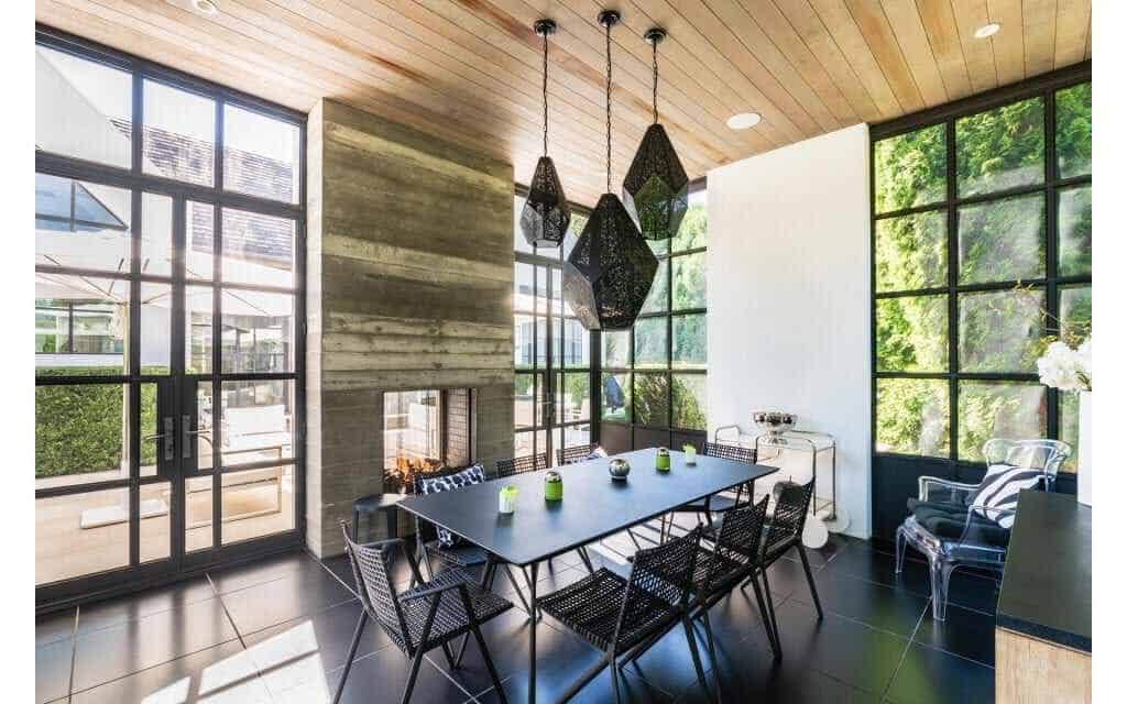 High style abounds at this serene gated compound in the heart of the village. Modern and creative, the estate is designed by renowned Designer John Vancheri. Built by Phil Pape, the five-bedroom, five-and-a-half bath home is modern rusticity at its finest. Featuring weathered woods, heated concrete floors, and stunning architectural details, this wow house is not to be missed. Enter the home through an extra wide main hall, which leads to the open living, dining and kitchen area featuring an 18-foot ceiling peak. Additionally, the first floor includes a grand master bedroom suite with its own terrace, his-and-her baths, walk-in closets