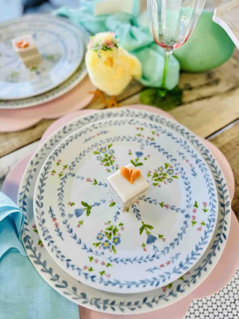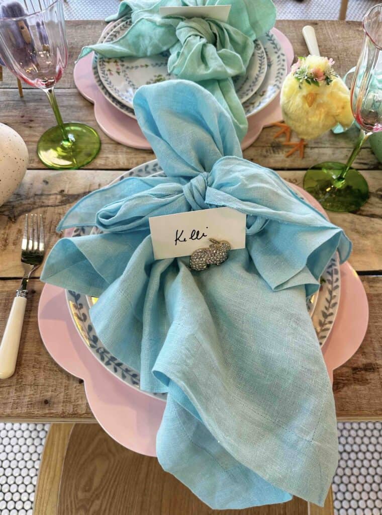 ”Easter tablescapes are my absolute favorite to design,” shares Hamptons hostess Kelli Delaney Kot. ”A pastel palette, baby bunnies, spring flowers, and decadent sweet treats are all part of the fun. A color mix of bow linen napkins by Joanna Buchanan paired with her bejeweled bunny place card holders will make every guest smile, and my Duggan Society limoges plates over Addison Ross lacquer placemats complete the setting. Sweet, festive, and full of charm — just the way Easter should be.” Visit joannabuchanan.com; duggansociety.com