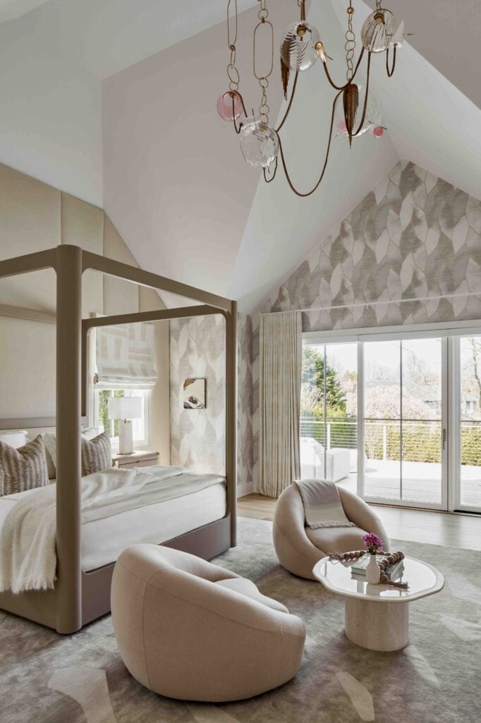 Layers of wood, glass, and upholstery harmonize, while clusters of simple globe lights add warmth and drama, Berney explained. “Altogether, the room feels both natural and refined, and it embodies the balance of comfort and elegance we wanted for the entire home,” she said.