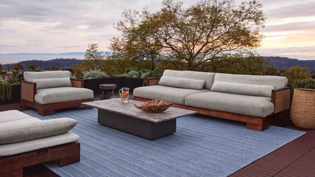 Outdoor spaces are getting furnished with lounge chairs, pillows and throws, umbrellas, rugs and sofas or sectionals. Today’s furnishings are plusher, bigger and more permanent thanks to advances in weatherproof fabric technology. Outdoor rugs are used to delineate areas, perhaps being placed under a dining table or in front of a couch.