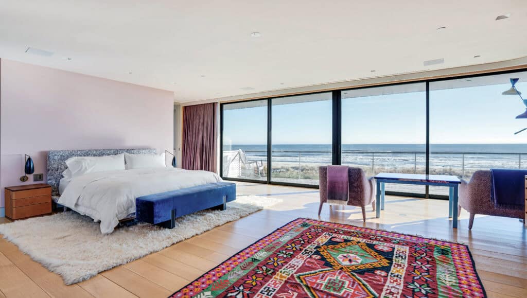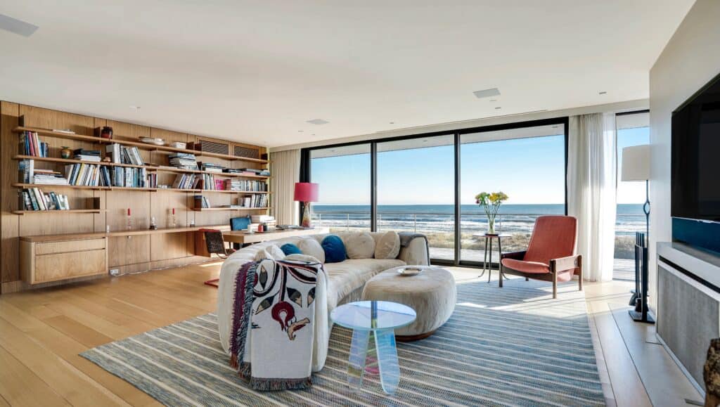 Conceived in collaboration with Mark C. Matthews Architecture and interior designer Francis D’Haene of D’Apostrophe Design, the residence was built to function simultaneously as a private family retreat and a gallery-quality setting for serious contemporary art. UV-protected Arcadia glass walls and top-tier specialized glazing were installed throughout to protect the collection from coastal light and salt exposure — a level of technical consideration that is rare even among the Hamptons’ most expensive oceanfront properties. Inside, a three-story glass elevator maintains ocean views at every floor. Two fireplaces, a gym, and a media room round out a residence that manages to feel both monumental and livable.