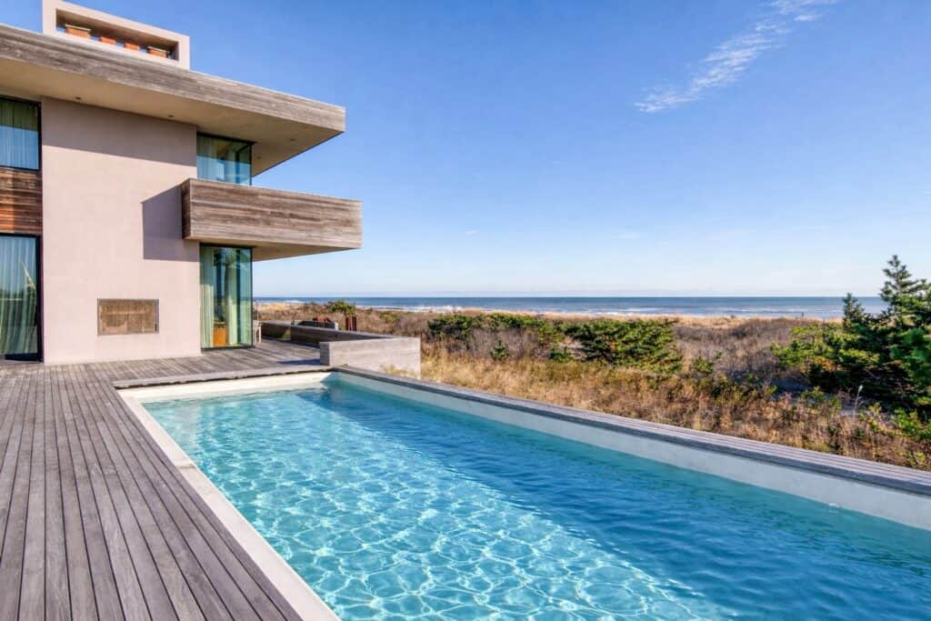 The oceanfront residence at 15 Dune Road in Bridgehampton has just come to market at $45 million, listed with Kyle Rosko, Keren Ringler, and John Gomes of Douglas Elliman. On its face, it is a masterwork of coastal architecture — seven bedrooms, private direct ocean beach access, a heated gunite saltwater pool sitting directly on the ocean side, and a linear shoreline layout that gives every principal room unobstructed water views. Sunrises over the Atlantic to the east. Sunsets over the bay to the west. The house is, in the most literal sense, oriented toward light.
