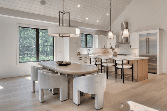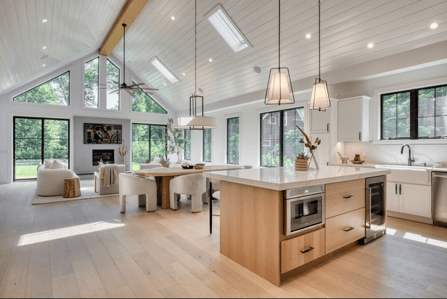 As you step through the door, you’re met with impressive soaring ceilings and incredible floor-to-ceiling windows that fill the home with natural light. The polished concrete fireplace adds a sleek touch to the open layout, while the 8″ white oak flooring brings warmth and elegance throughout.