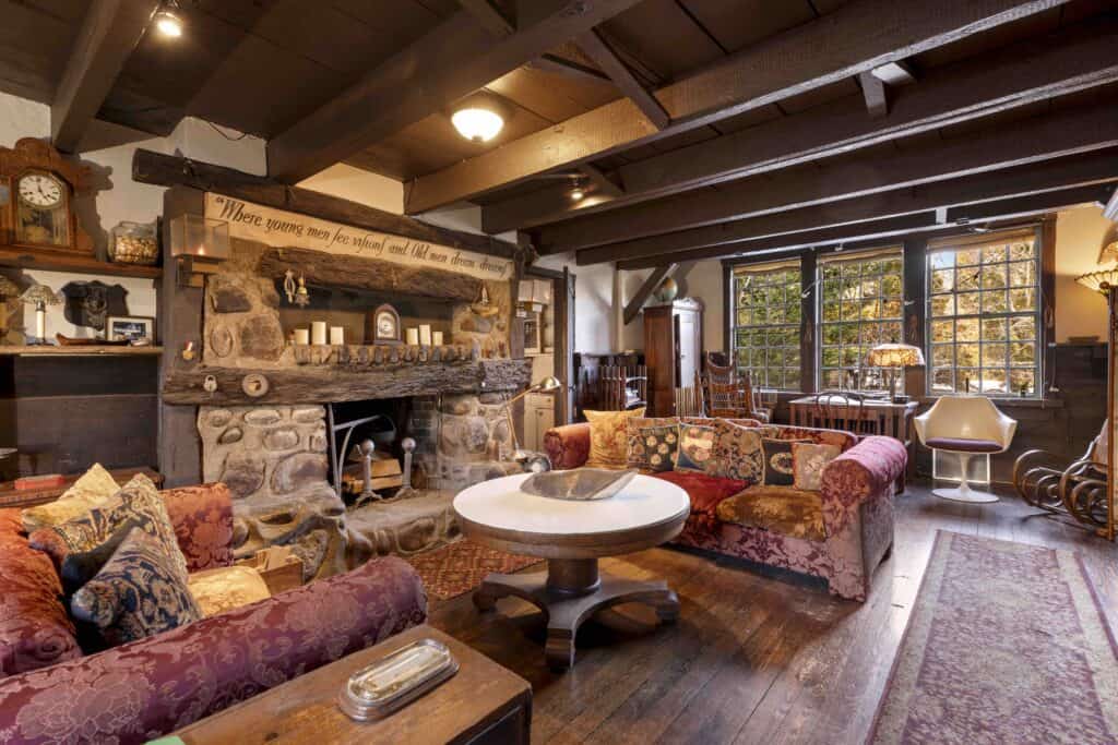Built by craftsman Julius Imer using salvaged ship timbers and local stone, the house features antique hearths, thick hand-crafted doors, and a great room that would likely delight Tolkien himself. Situated on just under a quarter acre, the property offers room for a pool, an outdoor shower, and the rare opportunity to live in something truly unlike anything else on the market.
