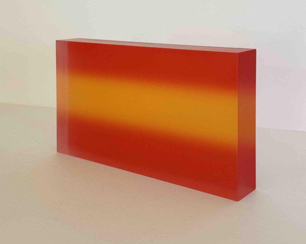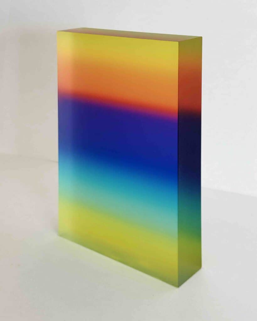 Her first experience was working in a Toronto studio that designed and produced Plexiglass frames. An early foray into digital photography when she worked as a graphic designer in New York gave her an edge to the medium and ways it could be utilized beyond traditional film photography. Inspired by the beauty and surf culture of Montauk she created large scale panoramas of surfers interacting with the ocean. From the panoramas she shifted to a Strata series based on a composite image that merges several layers horizontally. “The next idea was to reduce one of the Strata images to its structural elements. Once simplified it became an exercise in color, keeping the proportions of the Strata series but freed from existing imagery. That was the beginning of printing the images on blocks of plexi 6 x 10 x 1.5 inches hoping the viewer would experience the image as if it were floating within the plexi block.