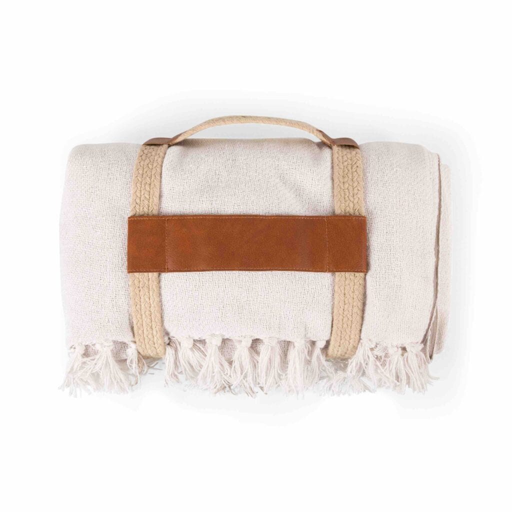 Montecito white and brown outdoor picnic blanket with carrying handles. Topside is cotton. Underside is water resistant polyester. $98.95, crateandbarrel.com